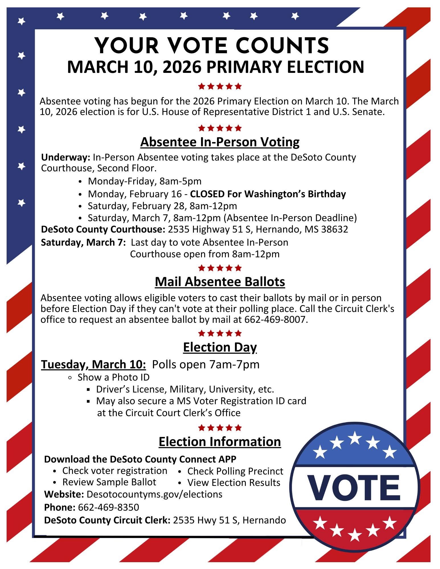 In-Person Absentee Voting is only available at the DeSoto County Courthouse, Second Floor (Circuit Clerk’s Office) now through Saturday, March 7th.